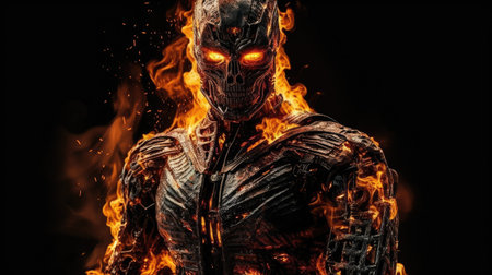 Cyborg in the fire. 3D rendering. Futuristic concept.