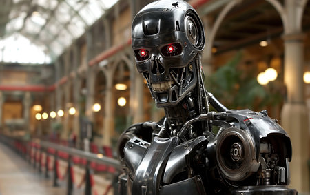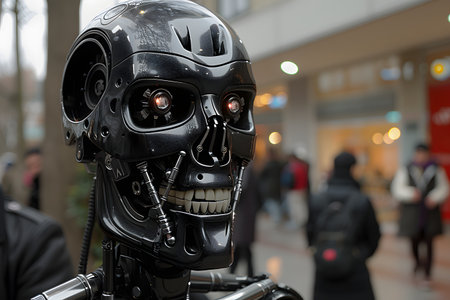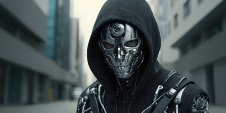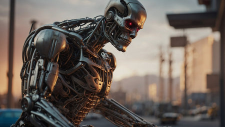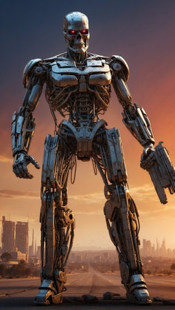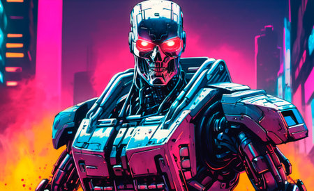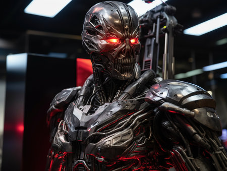 An AI generated illustration of a futuristic robotic figure stands with a menacing weapon