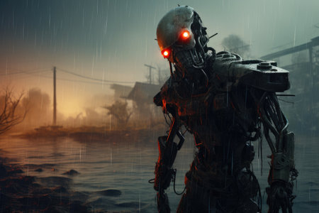 Echoes of Warfare: Cyborg Sentinel in Rainy Aftermath