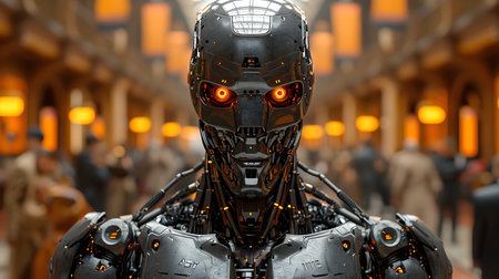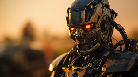 futuristic robot with glowing red eyes, intricate circuitry. metallic face illuminated by red lights. blurred background cityscape lights, enhancing advanced, intense atmosphere. AI generated