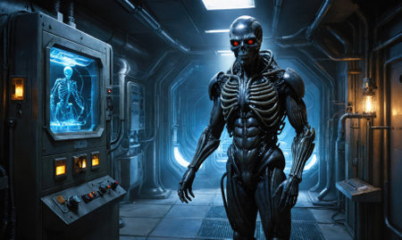 A robotic figure stands in a futuristic laboratory with a glowing blue screen displaying a skeletal figure