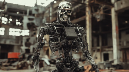Damaged metal skeleton robot, without human shell, humanoid with artificial intelligence, in destroyed abandoned environment, machine in war against humanity, metal combat robot and soldier