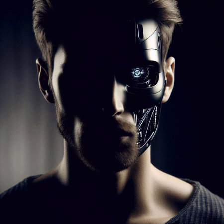 Side profile of a humanoid face shows advanced mechanical implants and a glowing robotic eye, showcasing a futuristic aesthetic.