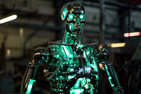 A metallic automaton robot with fluorescent accents that seem to shift and change AI generated