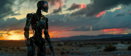 A robotic figure stands with glowing eyes in front of a vibrant sunset, creating a striking contrast between man-made technology and natural beauty.