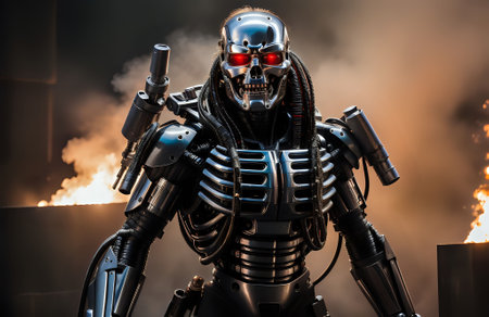 The Rampaging Robot: Igniting War and Chaos with Severe Repercussions. Concept Science fiction, Artificial intelligence, Future technology, World domination, Ethical implications