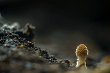 Sporangia of the Many Headed Slime of the species Physarum polycephalum scattered on dry leaves on the ground