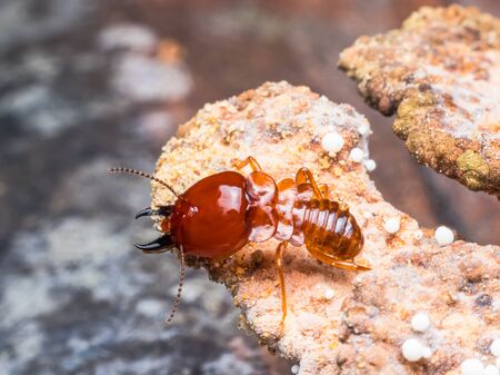 Close up termite soldiers are guarding the nest, Subterranean termites are the pest that will cause damage or destruction. If there is no control, They destroy the old wood rotting of the house