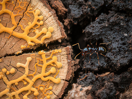 Close-up of a colony of termites infesting a decaying tree stump, illustrating the cycle of decomposition