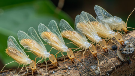Macro photography high quality image of winged termites on tree trunk emphasizing translucent wings