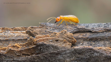 Close-up macro shot capturing a termite worker navigating through decaying wood, emphasizing the insect's segmented body and unique head structure while revealing its destructive nature