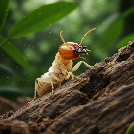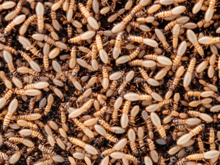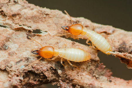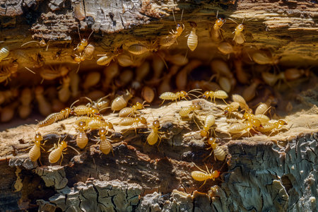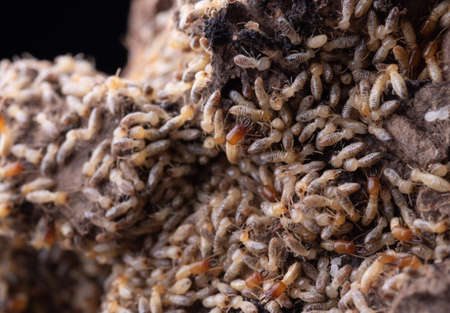 Close-up macro shot of termites feeding on a piece of decaying wood, highlighting the destructive nature of these insects and the importance of pest control