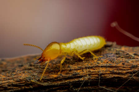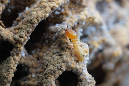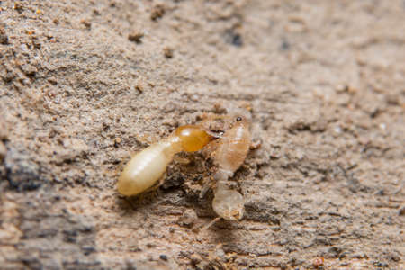 close up focus of the small termite on timber. The termite on the ground is searching for food to feed the larvae in the cavity.