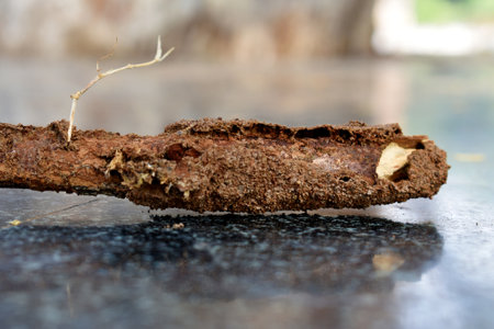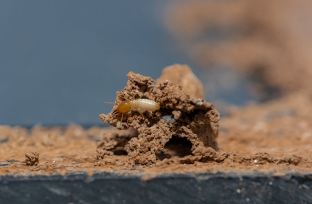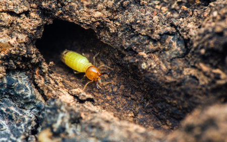 Close-up of worker termites crawling on damaged wood, highlighting the destructive nature of these insects and the threat they pose to wooden structures