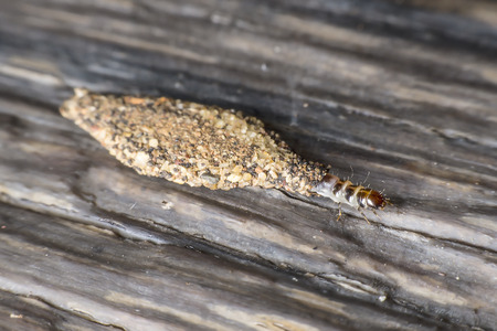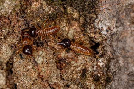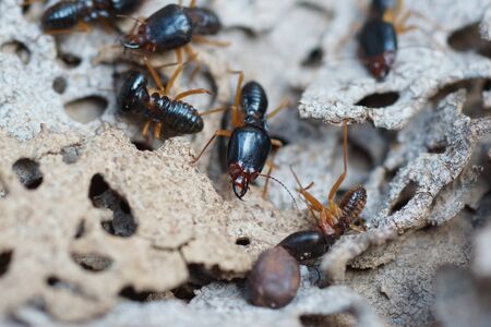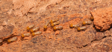 Group of the small termite on decaying timber. The termite on the ground is searching for food to feed the larvae in the cavity.