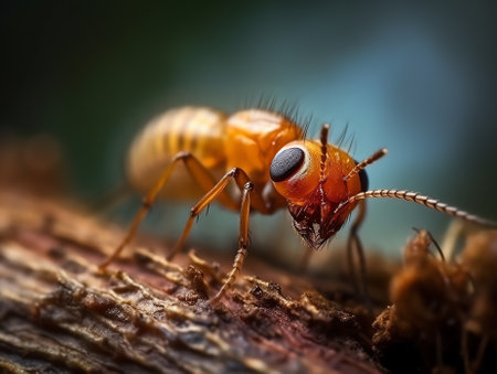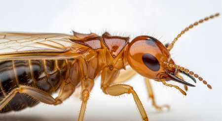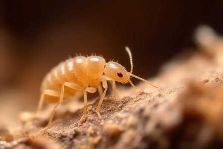Detailed high resolution photo of a termite on damaged house wood, capturing intricate details