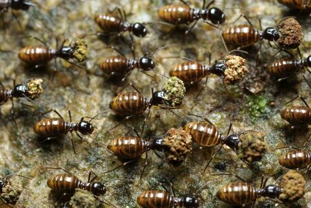 brown ants crawl along a rocky road