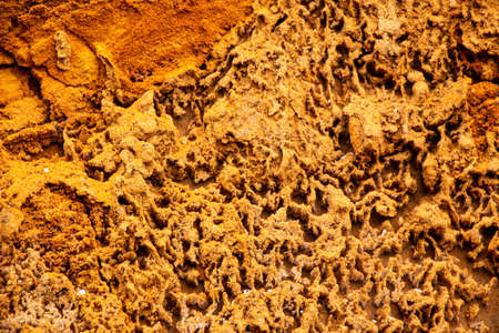 Textural sand, with a relief surface, multi-colored layers and different in size of granules, in an outdoor sand career, after mining ore and sand for construction.