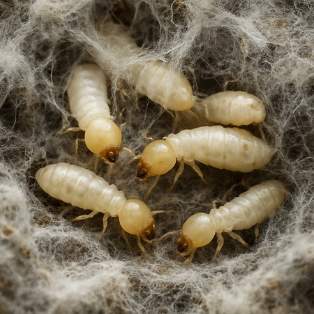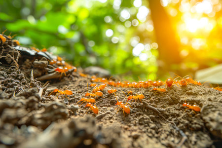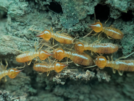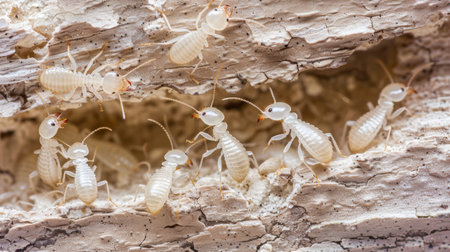 Close-up macro shot of termites feeding on a piece of decaying wood, highlighting the destructive nature of these insects and the importance of pest control