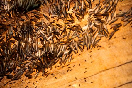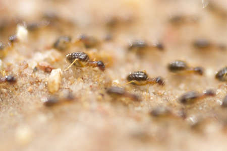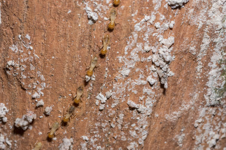 Detailed photography of termites working on wooden table, showcasing their wood damaging activities