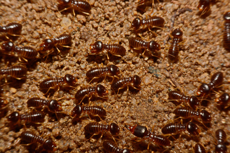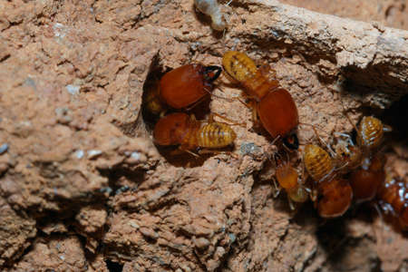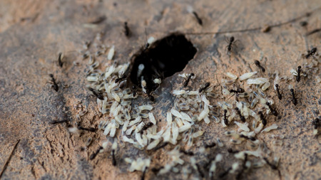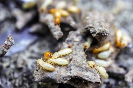 Group of the small termite on decaying timber. The termite on the ground is searching for food to feed the larvae in the cavity.