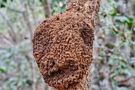 Details of a nest of wild bees on an exotic topical tree at the buraco das aras, Brazil, South America, with a very rugged and textured surface pattern of the bark
