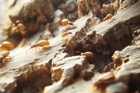 Close-up of worker termites crawling on damaged wood, highlighting the destructive nature of these insects and the threat they pose to wooden structures