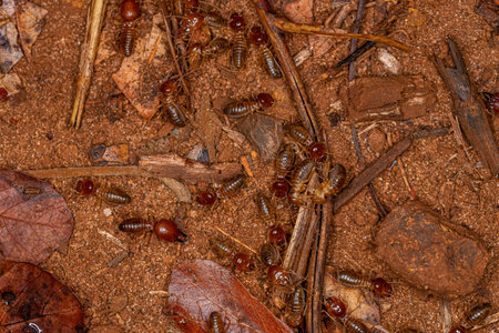 security soldier termites with worker termites on the forest floor in Saraburi thailand. Shallow DOF