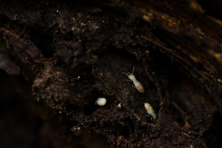 Worker termites actively consuming wood and damaging wooden structures, creating significant threats to buildings and posing challenges for homeowners and property management