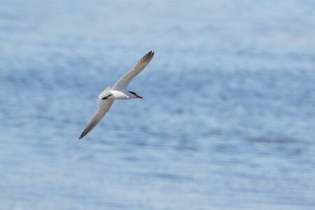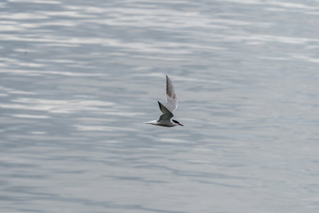 A tern in flight. Blue sea waves in the background. top view. Adult common tern in flight. Scientific name: Sterna hirundo. Natural habitat, summer season. Ladoga Lake. Russia.
