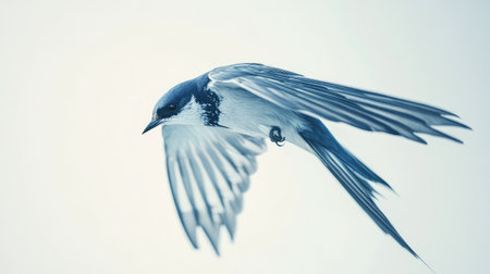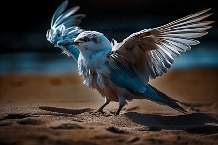 An AI generated illustration of a blue and white bird is in mid-flight, extending its wings in the air