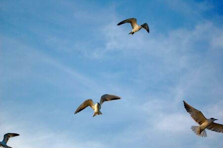 Panorama low angle view group of seagulls soaring flying under sunny cloud blue sky looking to be feed at shoreline of South Padre Island, Texas Gulf Coast, gulls are seabirds of Laridae family. USA