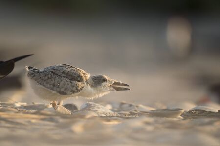 A Black Skimmer chick glows in the bright morning sunlight on a sandy beach covered in shells.