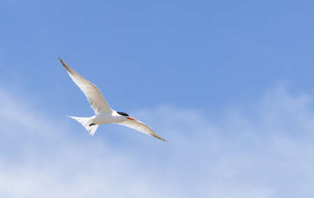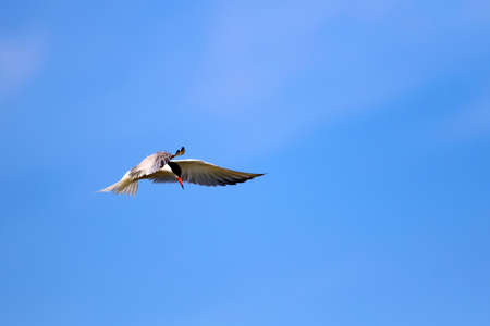 Turn with spread wings in flight. front view. Blue sky and sea waves in the background. Adult common tern in flight. Sterna hirundo. Natural habitat, summer season. Ladoga Lake