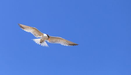Elegant tern, Thalasseus elegans, flying across a blue sky in search of fish in Huntington Beach, Southern California