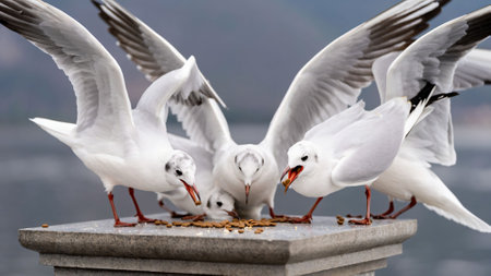 A lively group of seagulls gathered on a stone ledge, energetically feeding on scattered food.