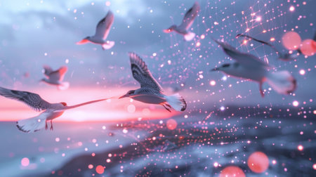 Seagulls flying at dusk over tranquil waters, backlit by sunset generated by artificial intelligence