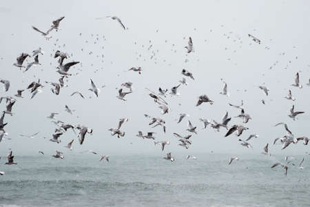 flock of sea gulls flying fighting for food on beach by the sea. Image with selective focus