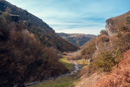 Norway landscape with mountain river and autumn forest