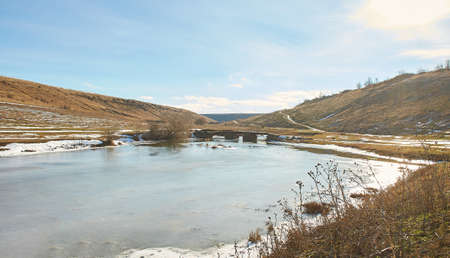 Beautiful natural landscape with birch and frozen river in winter.
