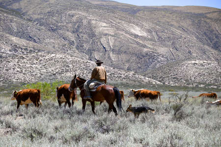 Argentine gaucho on horseback herding cows with his dog.