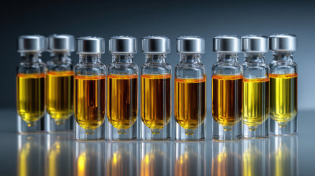 A series of daily ampoules are neatly aligned, displaying a range of vibrant colors, illuminated by studio lighting for a striking visual effect.