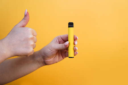 Yellow disposable electronic cigarette in female hand. Hand shows thumbs up