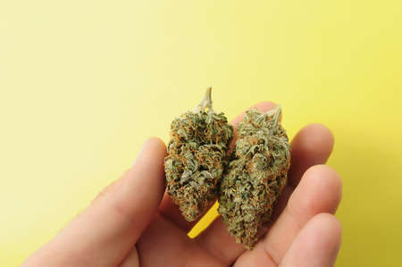 Marijuana buds close-up. Medicinal cannabis flowering on yellow background. CBD therapy, medical usage.