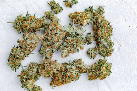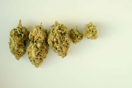 Macro layout of cannabis blooms, close-up. Medicinal CBD buds in row on white paper background. Drying marijuana flowers. Top view, flat lay.