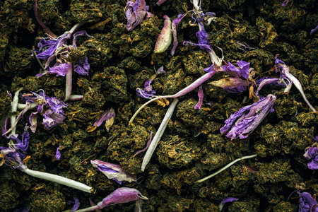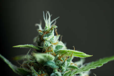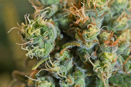 Macro photo of hemp inflorescence tips, thc crystals on cannabis shoots. Marijuana macro photo.