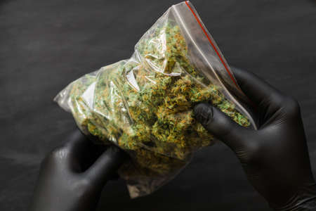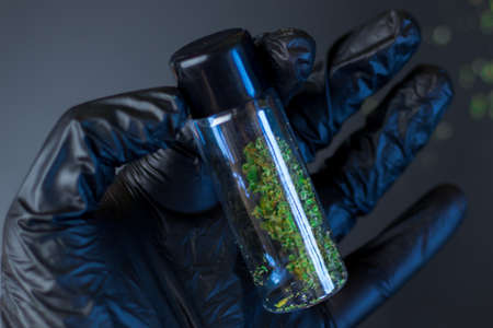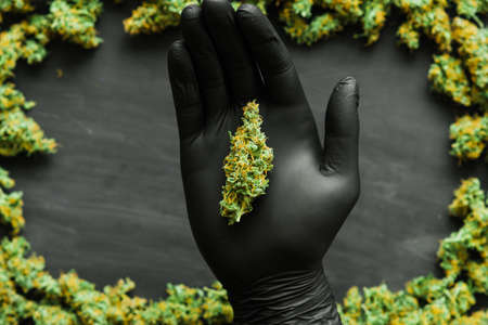 Cannabis science research concept. Serving of marijuana buds in black glove.