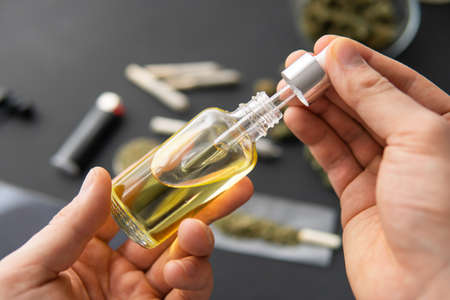 Hand holding bottle of Cannabis oil in pipette CBD cannabis OIL. hemp product, medical marijuana concept,