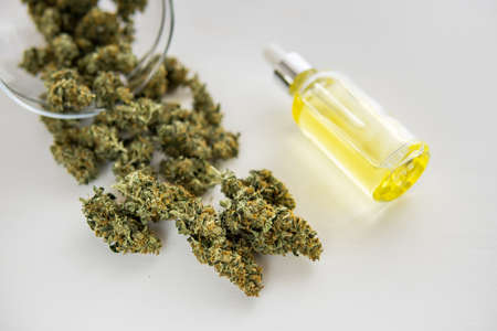natural herb, CBD cannabis OIL, Cannabis oil in pipette, medical marijuana concept, close up, hemp product,