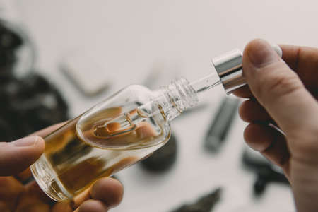 Hand holding bottle of Cannabis oil in pipette, natural herb, close up, medical marijuana concept, CBD cannabis OIL. hemp product,